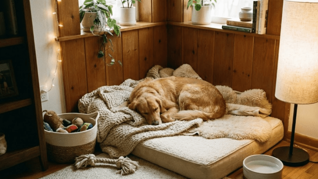 Prepare um cantinho especial onde seu cachorro possa se sentir protegido. Pode ser um closet, banheiro ou qualquer espaço pequeno e acolhedor da casa. Coloque a caminha favorita dele, alguns brinquedos, água fresca e, se possível, uma peça de roupa sua que tenha seu cheiro.