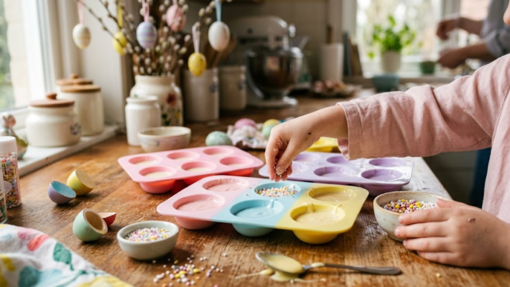 - Forminhas de silicone em formato de ovo (ou coelho, pintinho — o que a criança preferir!)