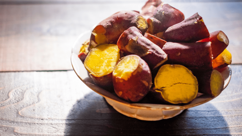 - Descasque e corte as batatas-doces em cubos, tempere com sal e azeite, leve ao forno
