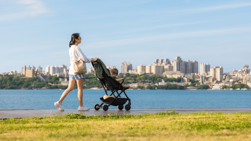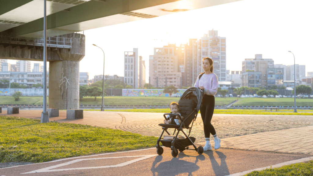 O passeio mais simples e libertador. Coloque o bebê no carrinho ou sling e dê uma caminhada de 15 minutos perto de casa. Você pega um ar, o bebê geralmente dorme com o balanço, e qualquer imprevisto você está pertinho.