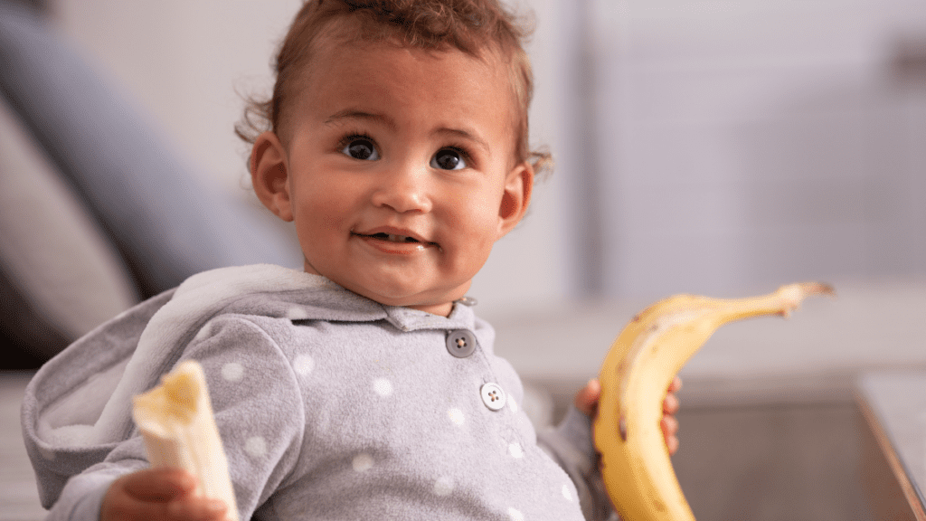 Banana: Rica em potássio, essencial para a função muscular e cardíaca. Também contém vitamina B6, que auxilia no desenvolvimento cerebral, e fibras que promovem a saúde intestinal.